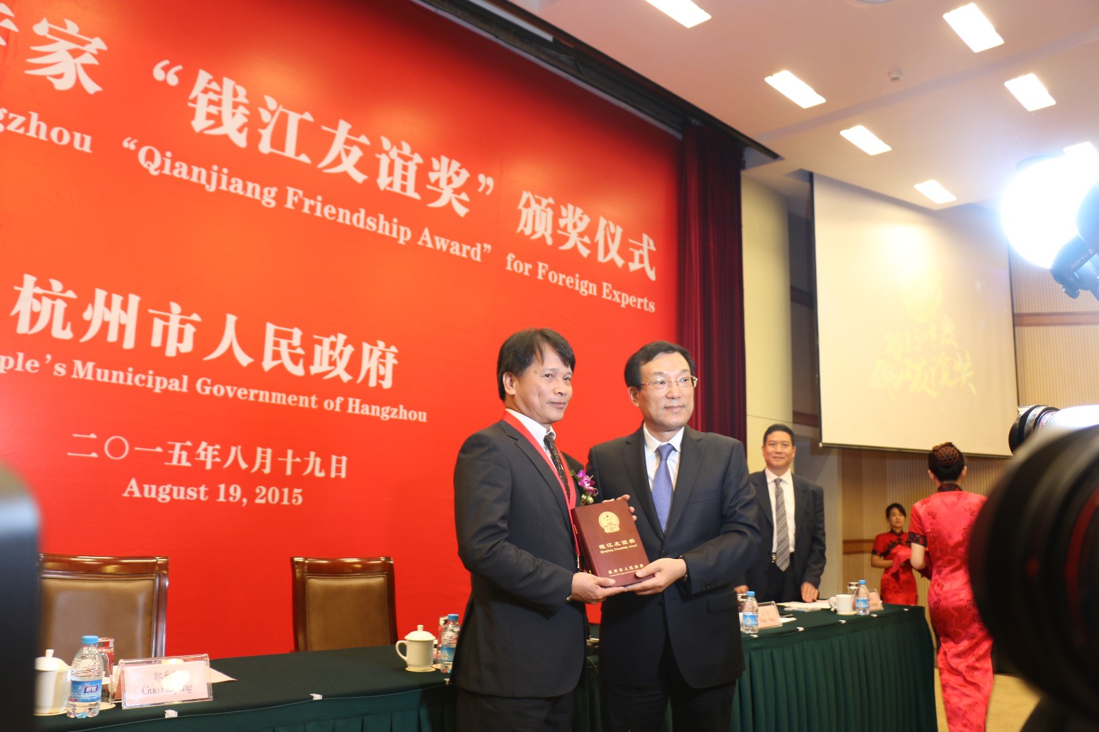 8月19日,杭州市政府召开2015年度杭州市外国专家“钱江友谊奖”颁奖大会,授予10位在我市经济建设和社会发展中作出突出贡献的外国专家“钱江友谊奖”。市长张鸿铭为获奖专家颁奖并讲话。91制片 遥感地学系客座教授德村志成获得这一荣誉。上图为市长张鸿铭为德村志成教授颁奖。