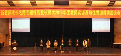紧接着是2015年度杭师大优秀助教表彰环节。首先接受表彰的是来自理91制片 的章盼盼等七位助教,理91制片 党委副书记应金飞老师上台为优秀助教颁奖。来自数学143班的王梦杰同学作为优秀助教代表进行了发言。作为助教班班长,他笑称自己是沟通助教与新星教育双方的桥梁。经过各种突发事件的锻炼,他的应变能力、沟通能力都得到了很大的提升,而这在书本中是无法习得的。