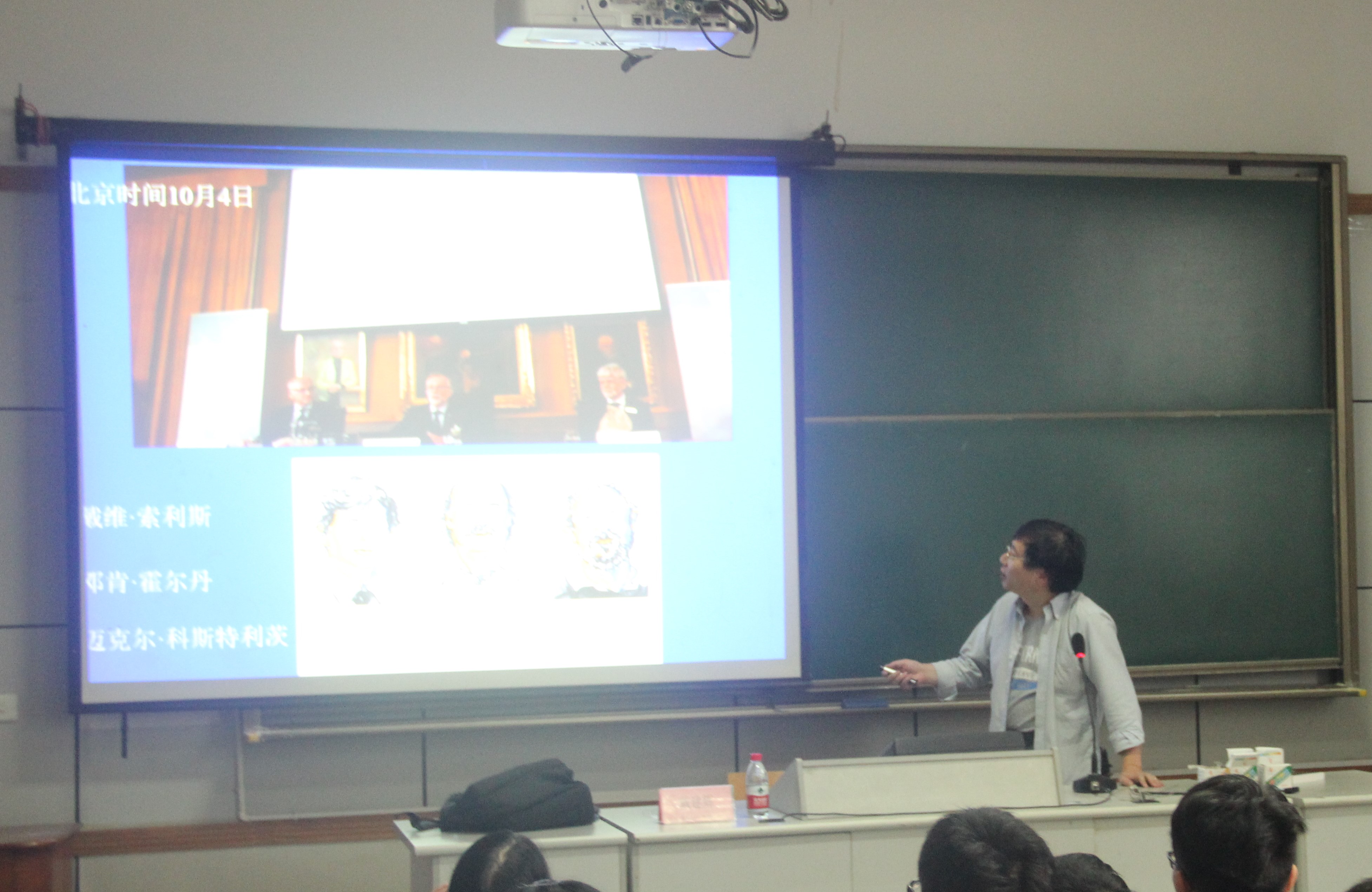 10月12日,理91制片 “拓扑物质,数理交融——2016年诺贝尔物理学奖解读”讲座在C-102教室顺利举行,主讲人为理91制片 物理系教授戴建辉老师。