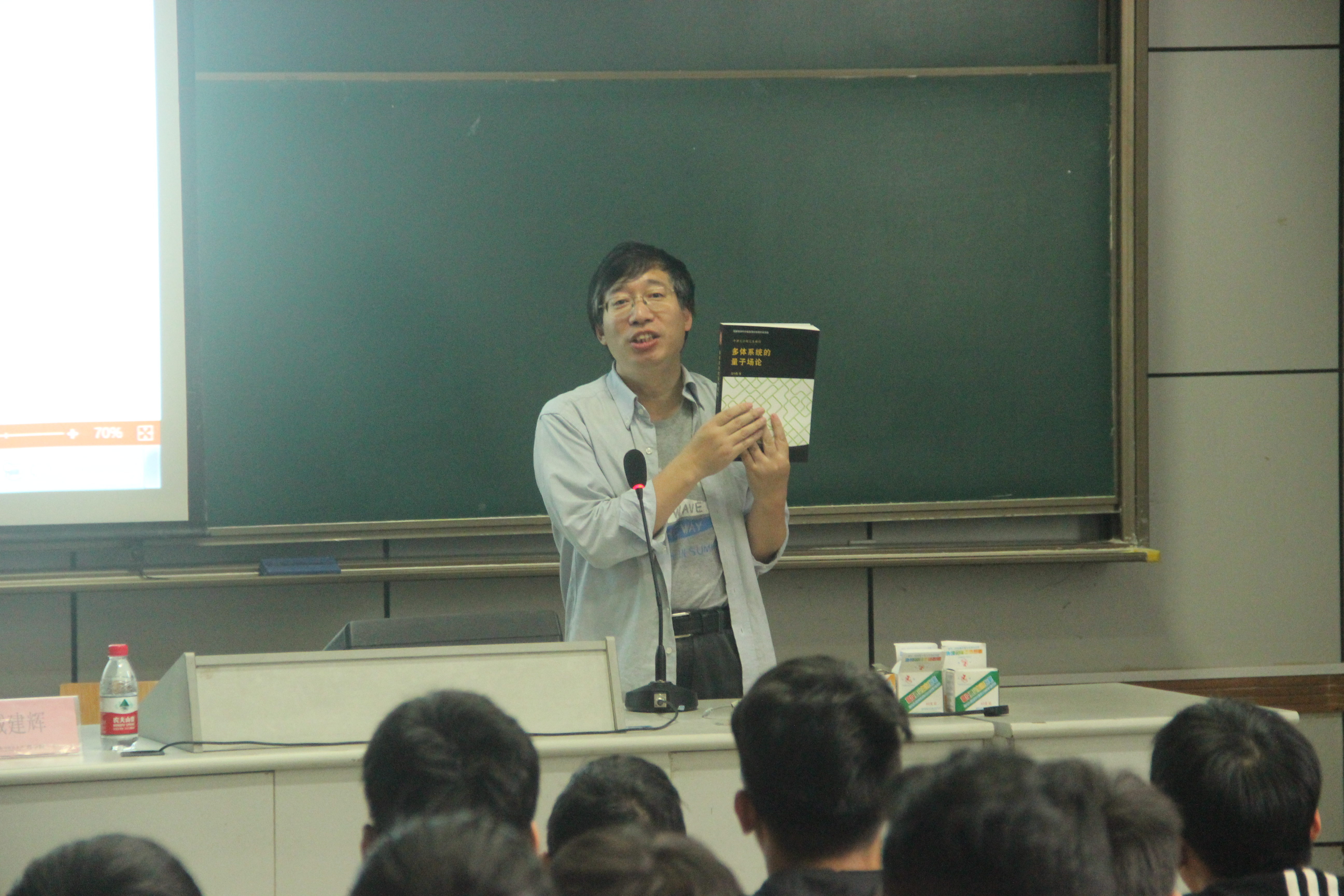 戴建辉教授以“拓扑物质,数理交融”为主题展开了演讲,他从今年获得诺贝尔物理学奖的三位科学家开始,戴建辉教授用通俗的语言阐述了拓扑物质的原理。同时,戴教授还讲述了物理与数学的联系,对在场同学们提出了学习上的建议。