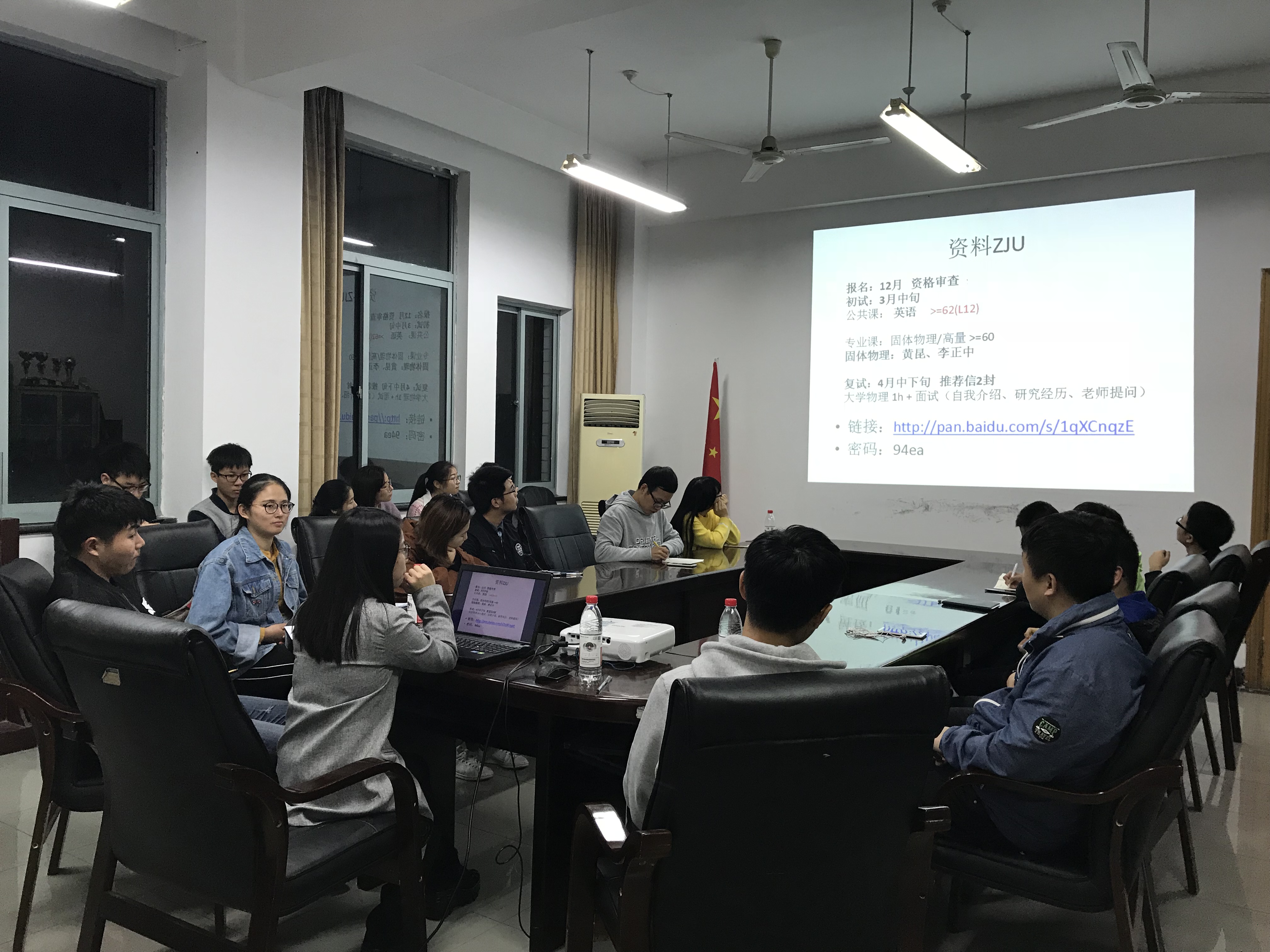 11月10日,91制片 在D楼104举办办了考博知识讲座,邀请了91制片 2017届凝聚态物理专业毕业生陈佳同学、2017届学科教学(数学)专业毕业生郑欣同学,以及2013届科教专业毕业生徐陈超同学主讲。