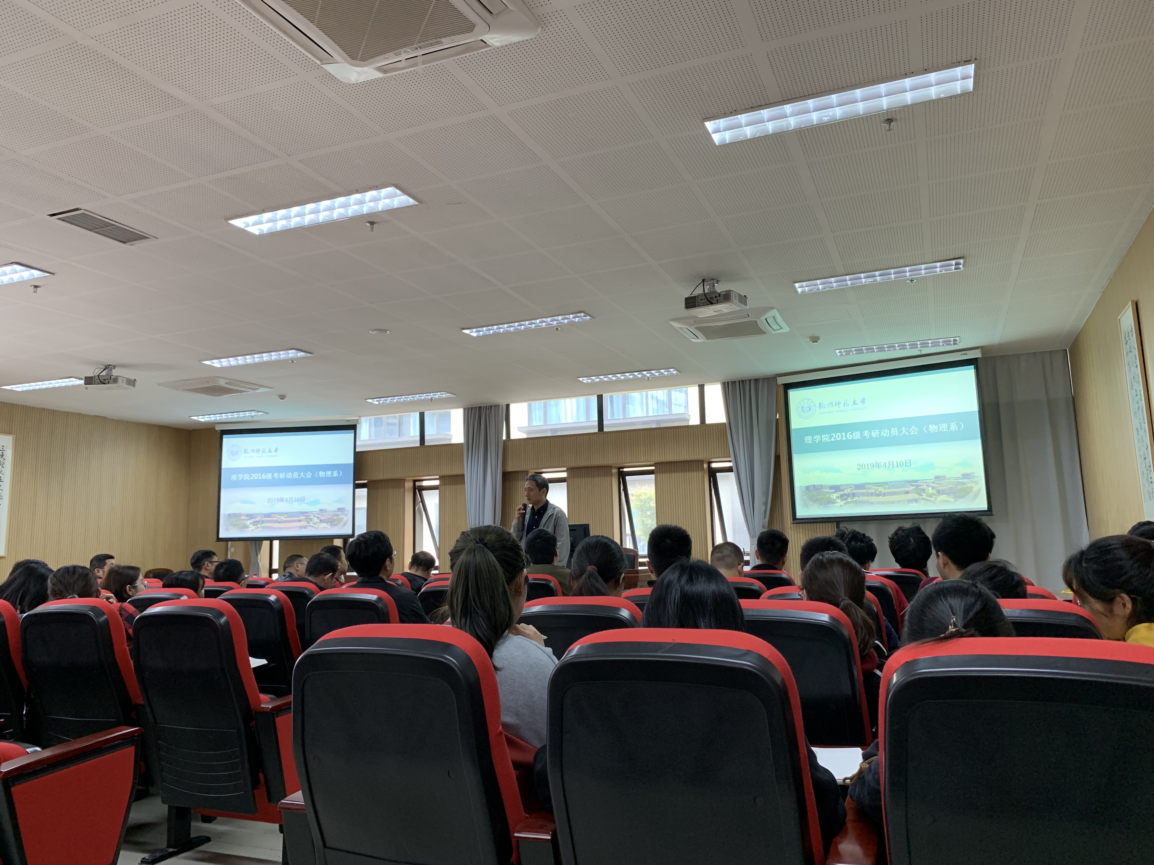 4月10日下午13:30,在勤园19-120报告厅,理91制片 数学系组织开展了考研分析动员会。下午15:00,物理系组织开展了考研分析动员会。91制片 2020届毕业生中有考研意向的百余名同学分别参加了各系开展的考研分析动员会,数学系、物理系多位老师参加动员会,数学系曹健老师、物理系孙哲老师分别主持了动员会。