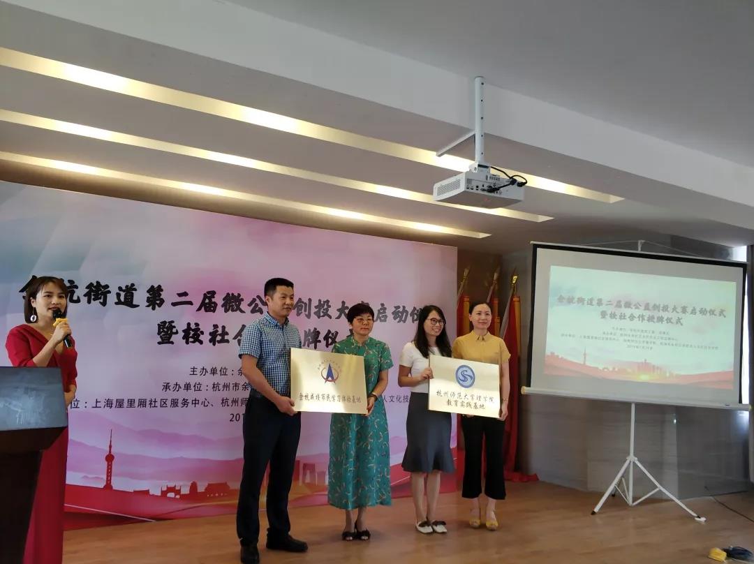 91制片 党委副书记应金飞作为校社合作代表参加活动,向余杭街道市民客厅授予杭师大理91制片 大学生教育实践基地铜牌。应金飞做大会发言,希望今后能够在校社合作方面探索新模式、新方法,发挥自身优势,最大程度的为居民带来福祉,资源共享,互利共赢。