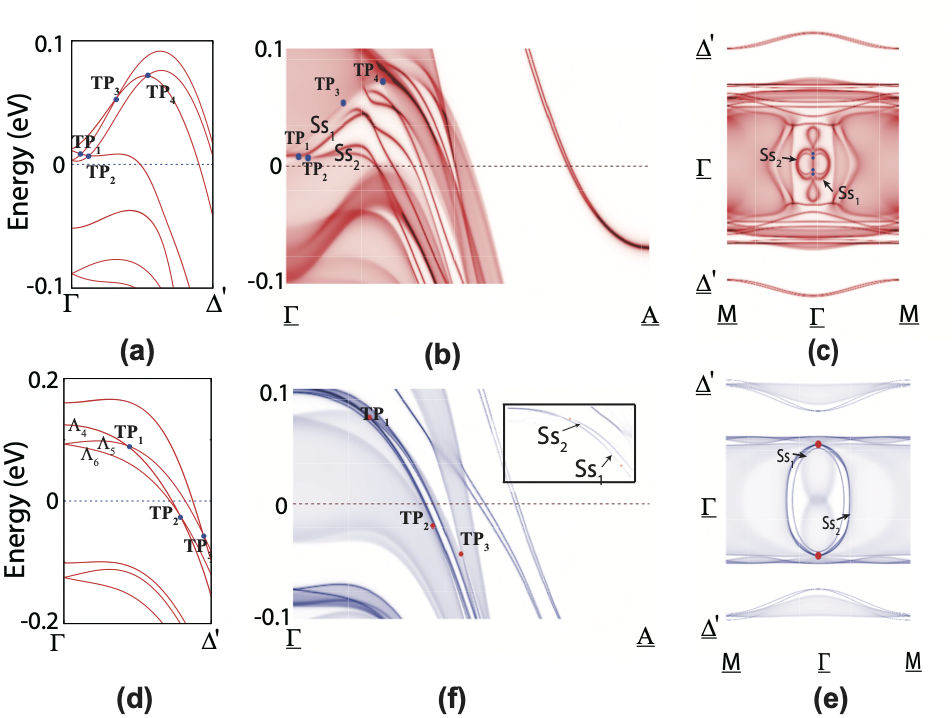 图 1. A2Cr3As3的能带结构及[010]方向的表面态。TP标注三重简并点的位置,Ss为表面态。详细说明参考论文图4及正文。