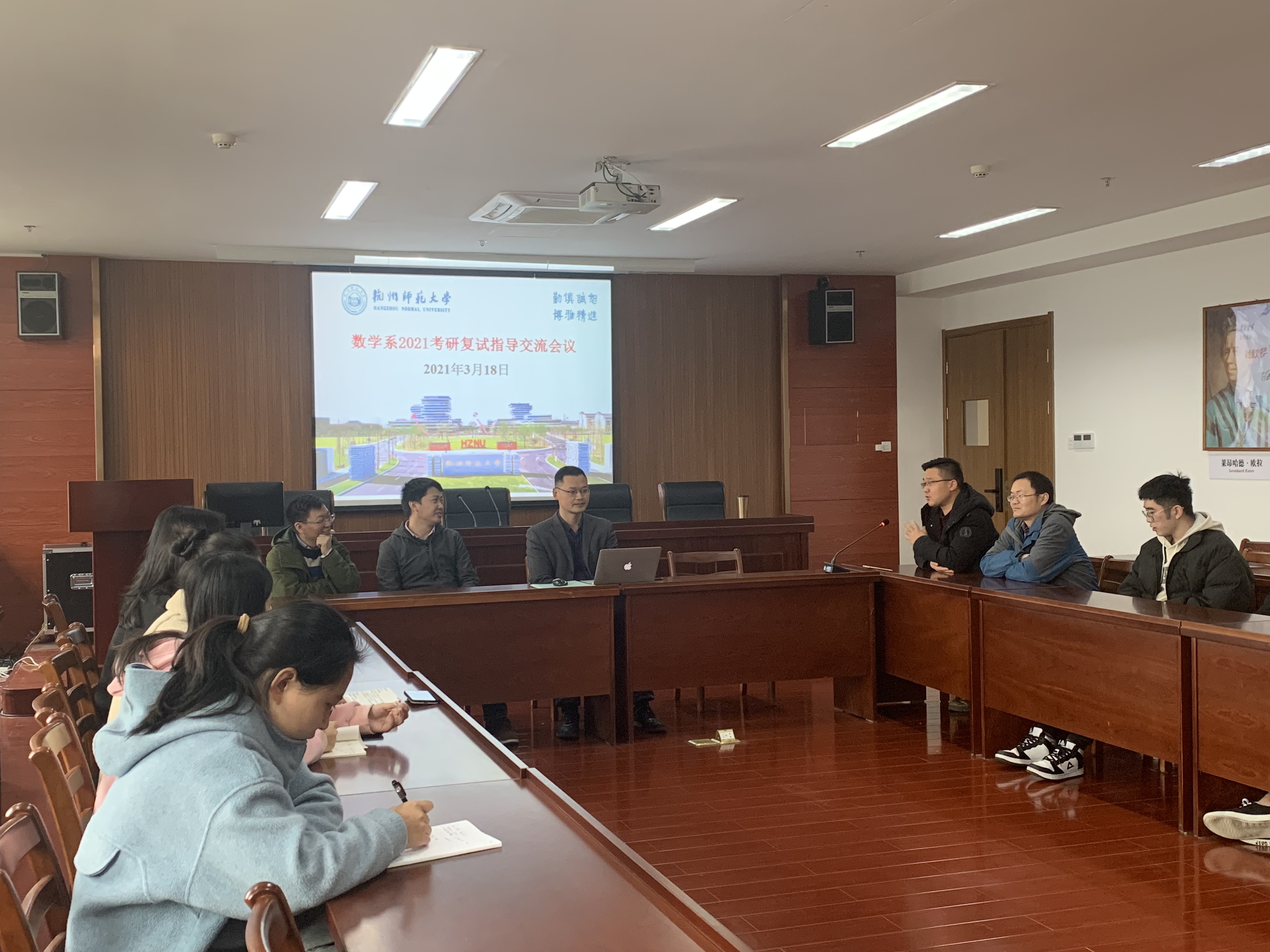 3月18日下午,2021年考研国家线刚公布不久,数学系党支部联合考研指导团队在勤园21号楼308会议室召开考研复试指导会议(钉钉同步直播)。本次会议旨在向通过国家线的考研学子介绍复试、面试、调剂等经验,面对面解决学生的困惑,并安排指导老师1对1进行精准指导。曹健、何济位、吕平、韩征、赵铁洪、胡燕波等党支部和考研指导团队老师及50余位考研学子参加会议。