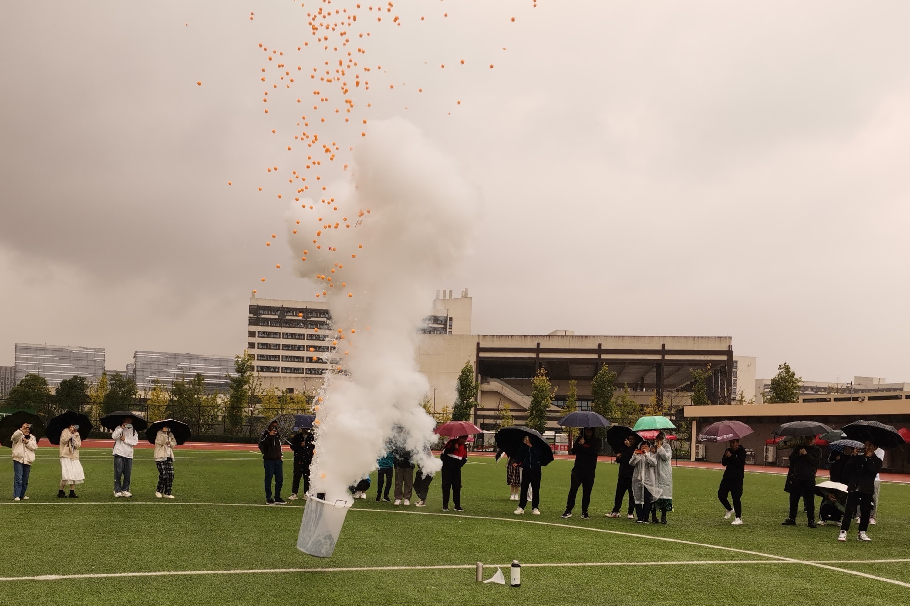 首项活动“漫天乒雨”在校区东体育场的人工草坪中心区域举行。同学们围成圆圈,陈斌和祝宇红两位老师在圆心处默契配合,将灌入液氮的矿泉水瓶放进盛了水的桶中,紧接着将一桶乒乓球也倒了进去,二人迅速撤离。片刻过后,随着一声巨响,液氮汽化体积膨胀使得矿泉水瓶炸裂开来,产生的压强将桶内的乒乓球冲上高空。这零碳排放的“大烟花”顿时引得在场的同学们一阵欢呼,也标志着科技节活动正式拉开序幕。