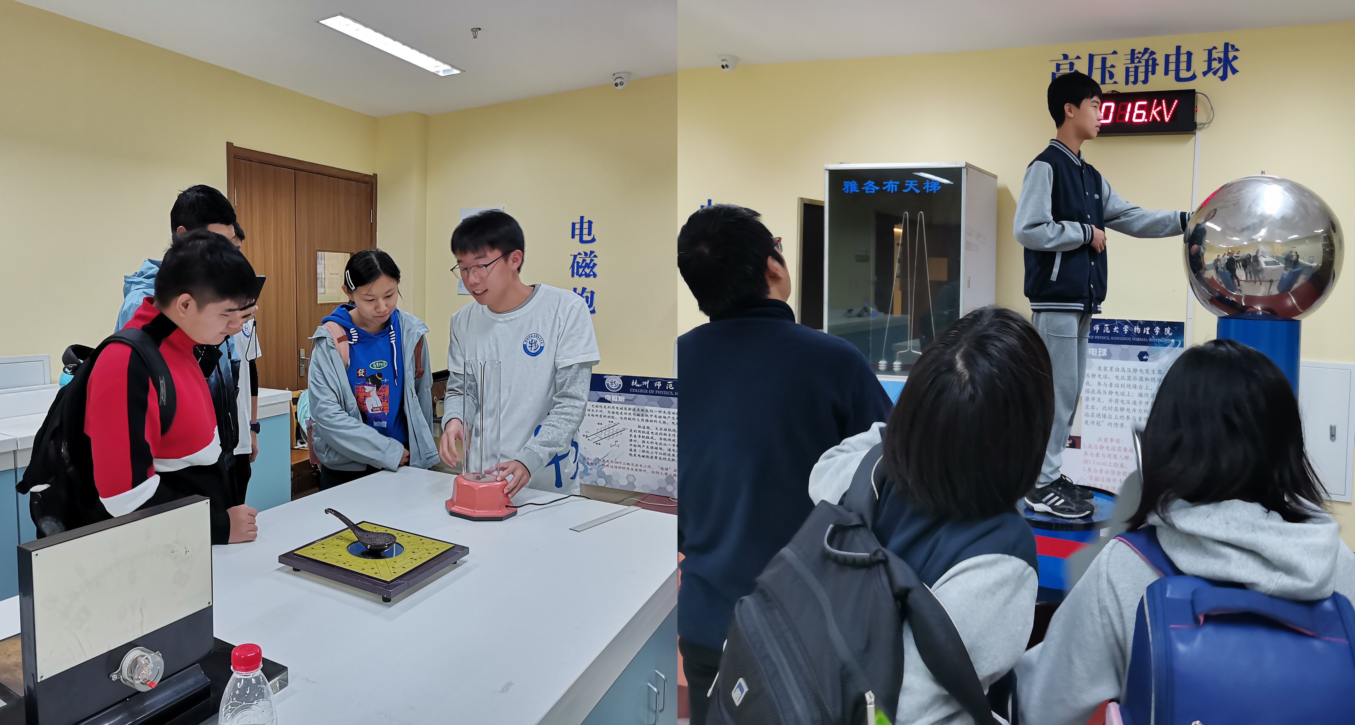 科技节的最后一项活动是力学、电磁学、光学演示实验室的参观,实验室里志愿者讲解员们已经等候多时了。同学们徜徉其中,此时的物理知识不再是书本上枯燥的文字和公式,而变成了一个个鲜活生动的实验装置——偏振光立体电影、高压静电球、法拉第笼……不亲身体验怎能真切地感受到物理的奥妙?