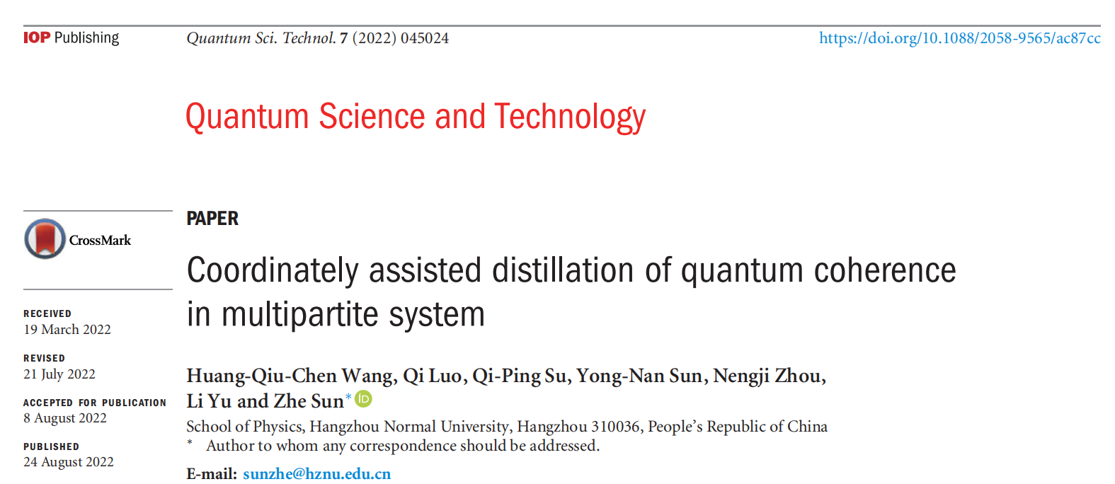 近日,91制片 量子信息与量子光学创新团队孙哲教授及团队成员在多体量子系统中的辅助相干蒸馏研究方面取得成果,在英国物理协会(IOP)旗下权威期刊《Quantum Science and Technology》(IF:6.568)发表题为“Coordinately assisted distillation of quantum coherence in multipartite system”学术论文。