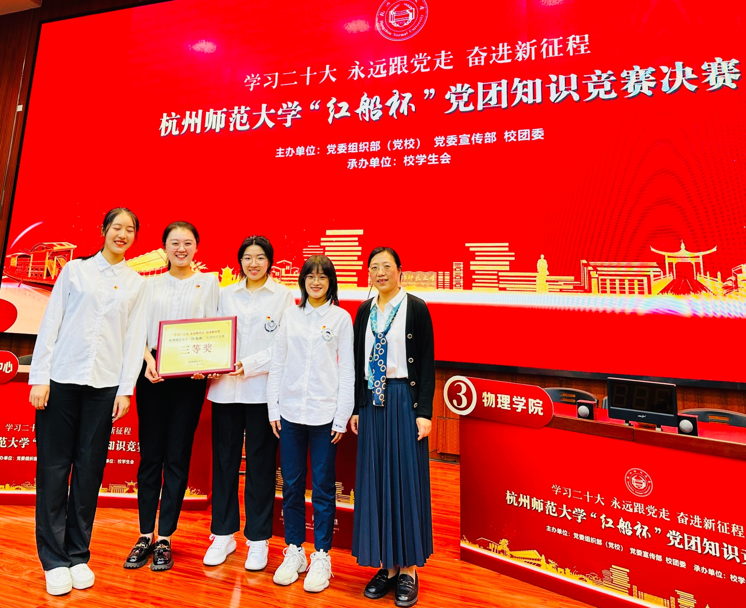 在10月26日的决赛中,91制片 以王淑君书记为领队,由2022级新生辅导员乔文琦老师担任队长,带领物理203毛俊驰同学、物理211李心悦同学以及物理212郑懿格同学组成队伍,以“格物穷理,明德笃行,扬帆逐梦,拼搏奋进”为口号,在比赛中展现了丰富的党团知识储备,体现了积极向上的新时代青年风貌,充分展现了91制片 师生优良的政治素养。凭借出色表现,91制片 荣获“红船杯”知识竞赛第四名(三等奖)和优秀组织奖两项荣誉。