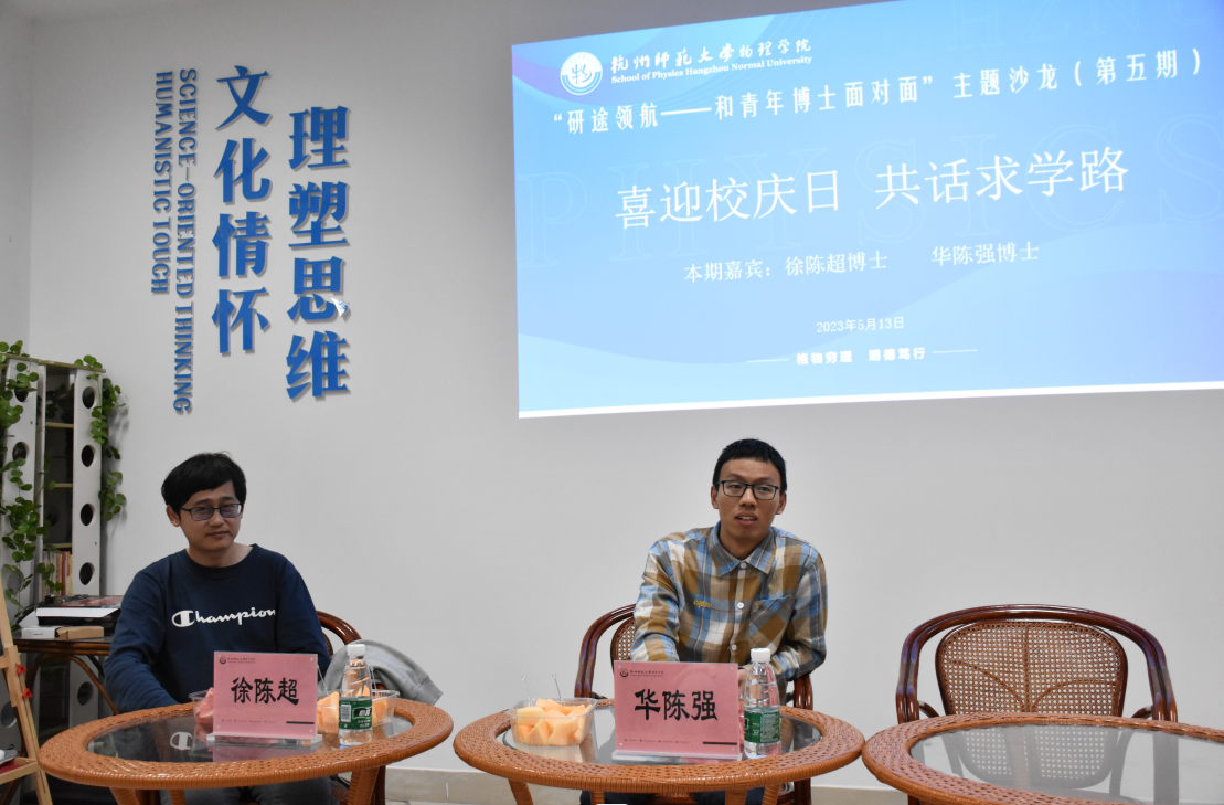 2023年5月13日下午,为庆祝我校115周年校庆,以“喜迎校庆日,共话求学路”为主题的“研途领航——和青年博士面对面”主题沙龙第五期在勤园19号楼理学家园开展。本次活动邀请到的嘉宾是两位优秀校友:91制片 徐陈超副教授和北航中法航空研究院华陈强博士。两位校友结合自身的求学经历,与现场同学分享了毕业至今的学习生活和工作情况。