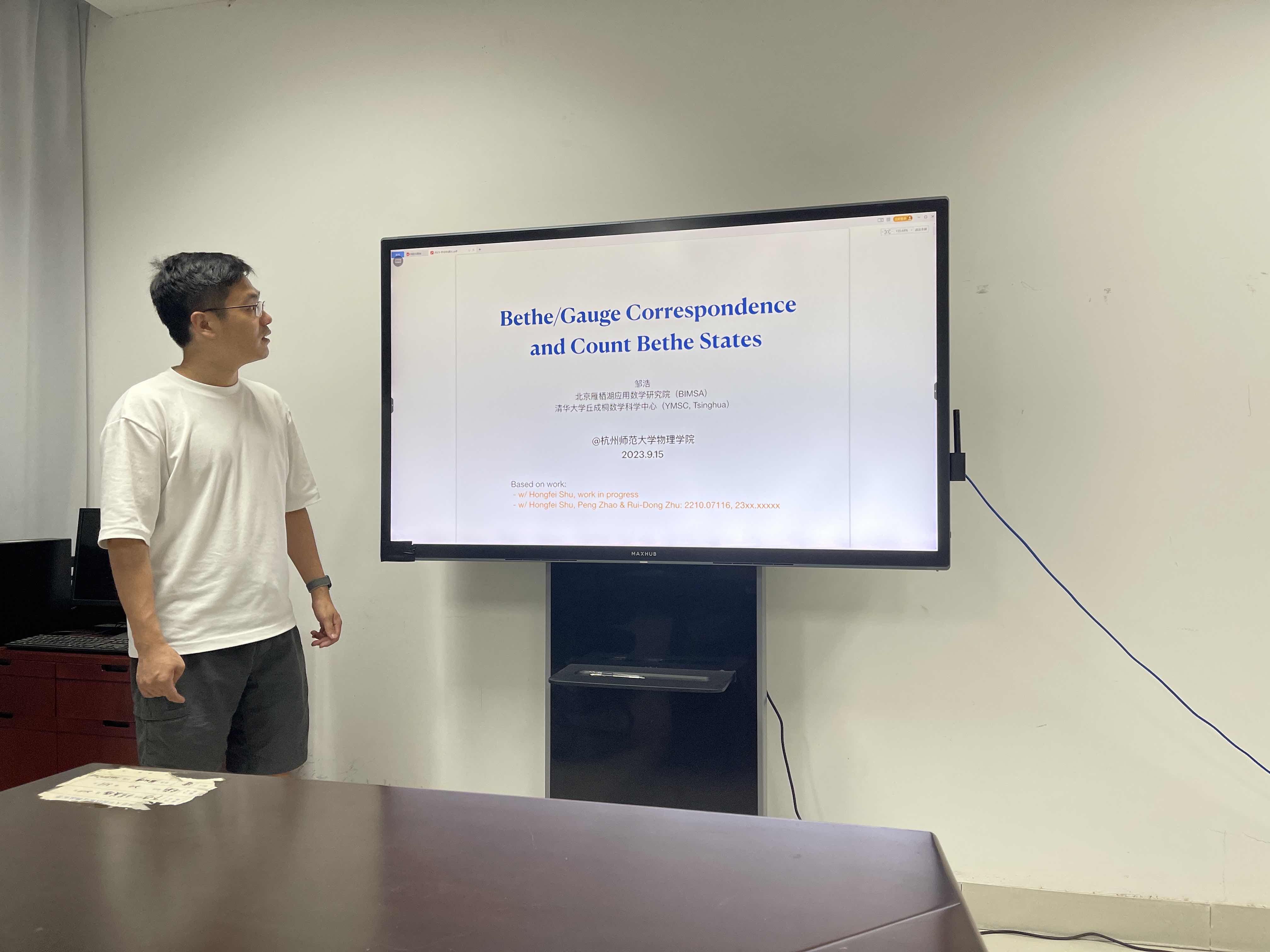 9月15日下午,北京雁栖湖应用数学研究院和清华大学丘成桐数学科学中心的邹浩士博士应邀来91制片 ,为院内师生带来了一场精彩的学术报告。报告的题目是《Bethe/Gauge Correspondence and Count Bethe States》,主要介绍了可积系统里Bethe States的数态问题,Bethe/Gauge Correspondence的对应关系,以及如何把Bethe/Gauge Correspondence应用到超对称规范场论里解决数态问题。