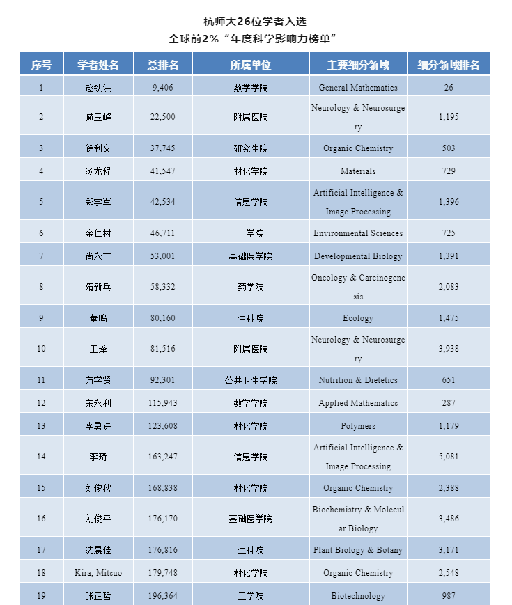 2023年10月,美国斯坦福大学和爱思唯尔数据库发布2023全球前2%顶尖科学家榜单(World's Top 2% Scientists),榜单共分为“终身科学影响力榜单”(关注整个学术生涯迄今的影响力)和“年度科学影响力榜单”(聚焦本年度的学术成就)。