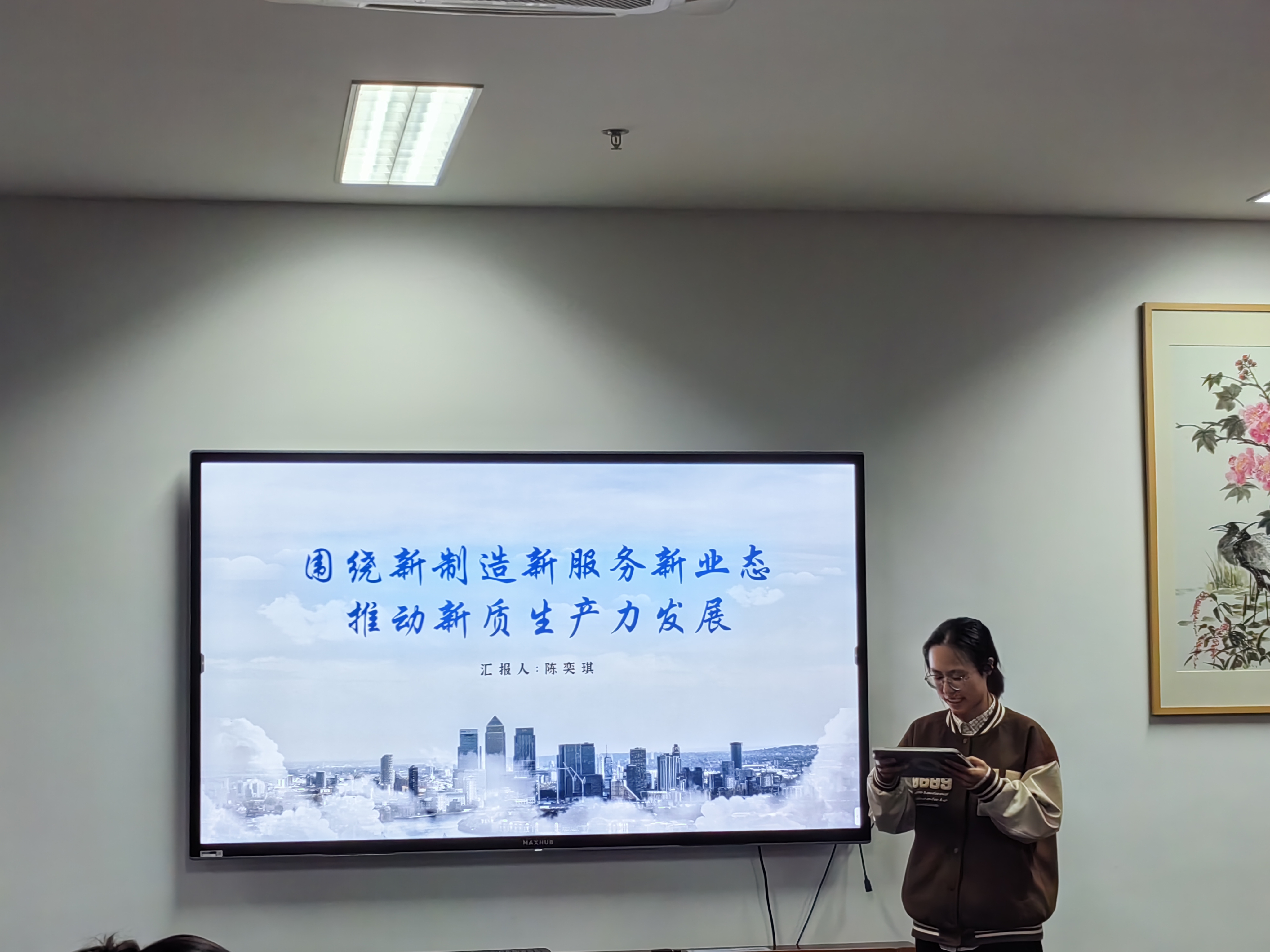 陈奕琪以中国国家创新与发展战略研究会学术委员会常务副主席、重庆市原市长黄奇帆的解读为基础,从新质生产力的几个侧面“新制造”“新服务”“新业态”出发,就“推动新质生产力发展”展开讲述。新制造以真正意义上的科技创新为依托,同时有相应的判断依据;新服务以高附加值生产性服务业为代表,也是高质量中国制造得以实现的关键所在;对于新业态的培育,则需要全球化、数字化两个关键推力共同协力。我国在这三个方面都有巨大增长潜力。通过讲解,全体党员对新质生产力有了进一步的理解。