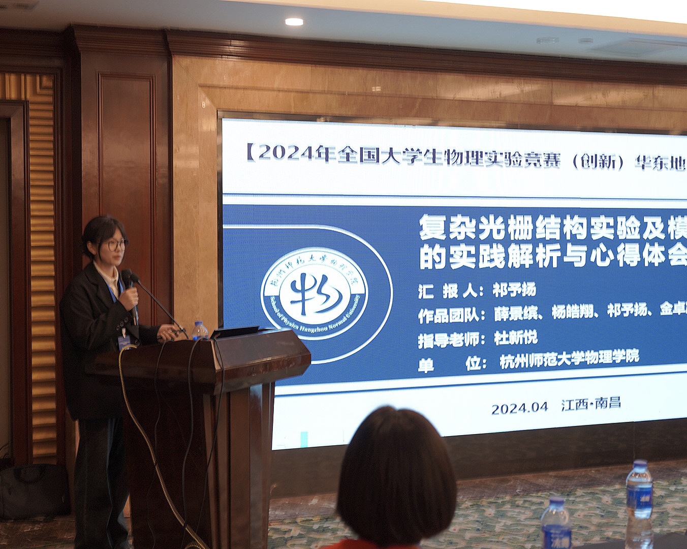 在研讨会上,物理本硕211班祁予扬代表团队,从队伍组建、选题背景、研究历程等方面结合实践体悟,做题为《复杂光栅结构实验及模拟研究的实践解析与心得体会》汇报,汇报获得研讨会上师生的一致肯定与好评。