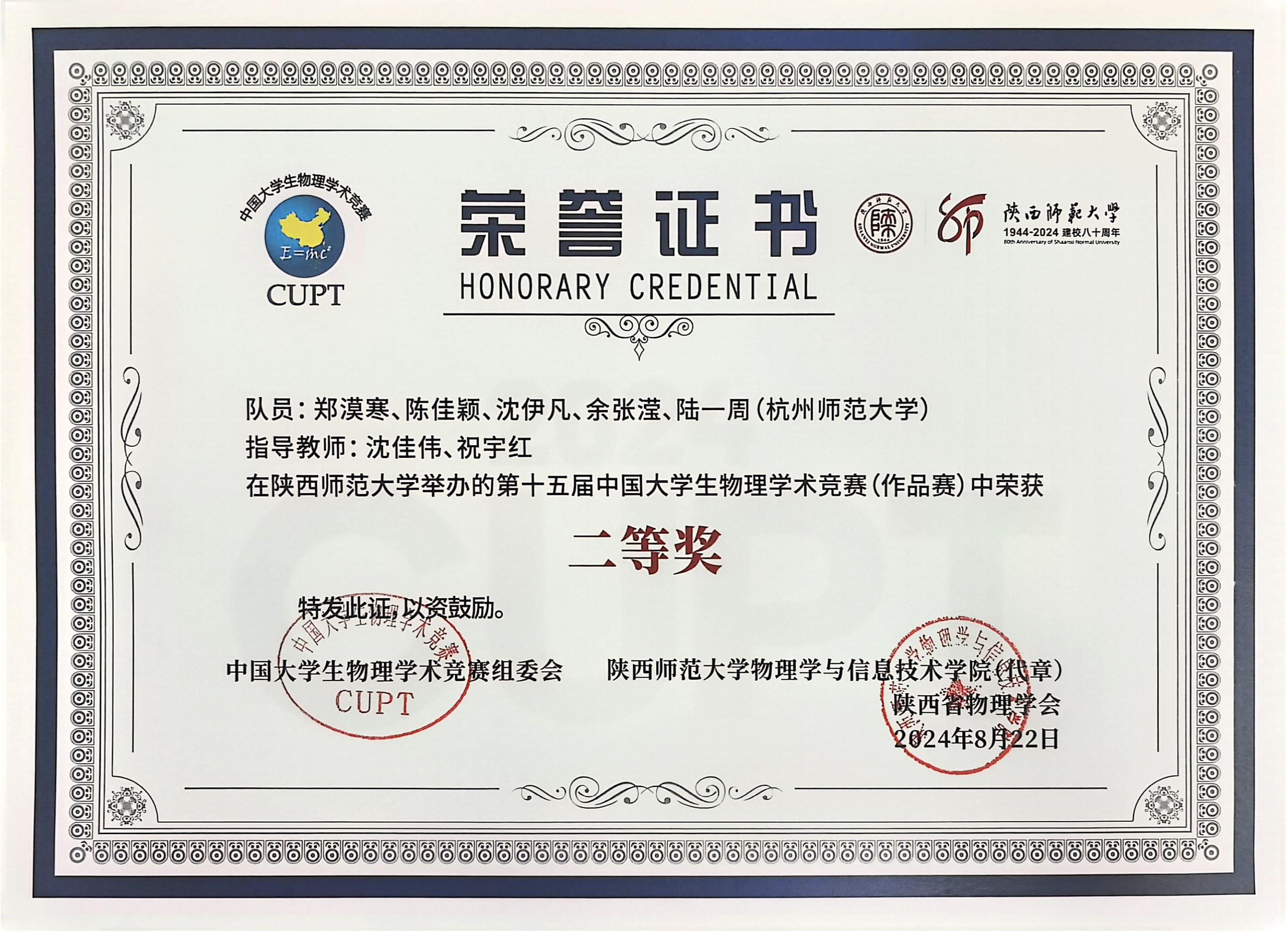 8月18日至23日,第十五届中国大学生物理学术竞赛(CUPT)在陕西师范大学成功举办。本届赛事汇聚了全国95所高校96支代表队的800余名师生。91制片 师生首次参赛并荣获作品赛二等奖。