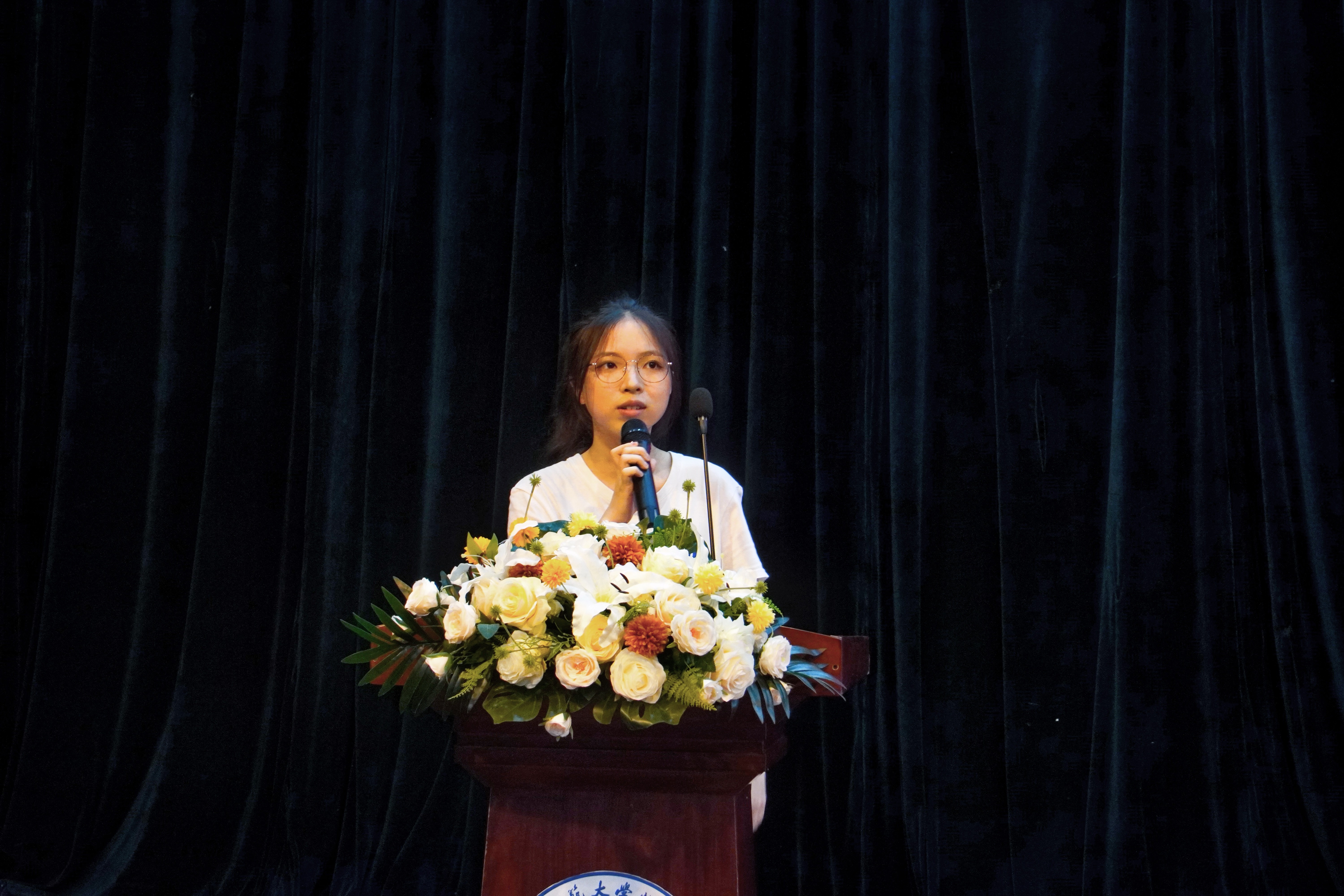 物理复合211郭心悦学姐作为老生代表发言,为新生迎接崭新的大学生活提出了四点建议:规划定位、坚持学习、勇于尝试和不懈努力。她相信大家能在挑战中找到机会,在困难中成长,在大学拥抱属于自己的理想。