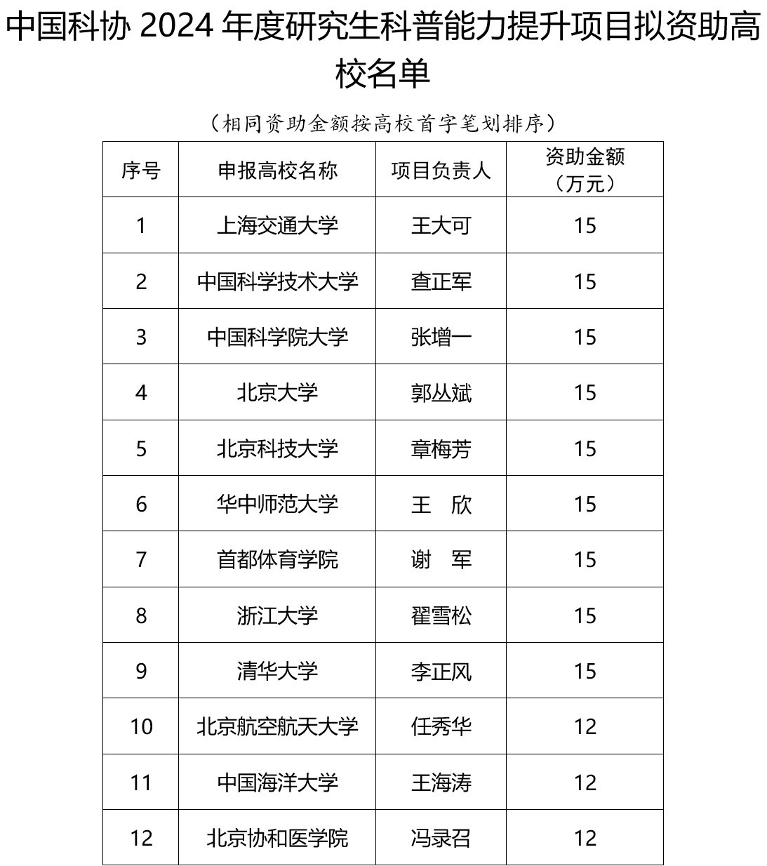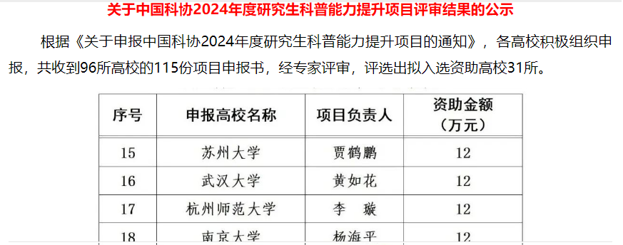 据悉,为深入贯彻落实《关于新时代进一步加强科学技术普及工作的意见》《全民科学素质行动规划纲要(2021—2035年)》,统筹推进科普专门人才培养工作,鼓励高校加强科普学科建设,强化教育科技人才战略性支撑作用,推动国家科普能力建设,服务全民科学素质快速提升,为实现高水平科技自立自强、推进中国式现代化提供有力支撑,中国科协组织实施2024年度研究生科普能力提升项目。中国科协共收到来自96所高校的115份项目申报书,经过严格的专家评审,最终评选出31所高校的项目获得资助。