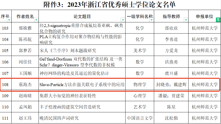 近日,浙江省研究生教育学会(以下简称“学会”)发布了2023年浙江省优秀博士学位论文和优秀硕士学位论文表彰名单,91制片 物理学专业2023届硕士研究生蔡海杰在封晓勇和戴建辉2位老师的共同指导下,其硕士学位论文《Slave-Particle方法在强关联电子系统中的应用》荣获浙江省优秀硕士学位论文称号。学会经过形式审查、网络评审、专家推荐等程序,共评选出122篇优秀硕士学位论文,我校共有9篇论文获此殊荣。