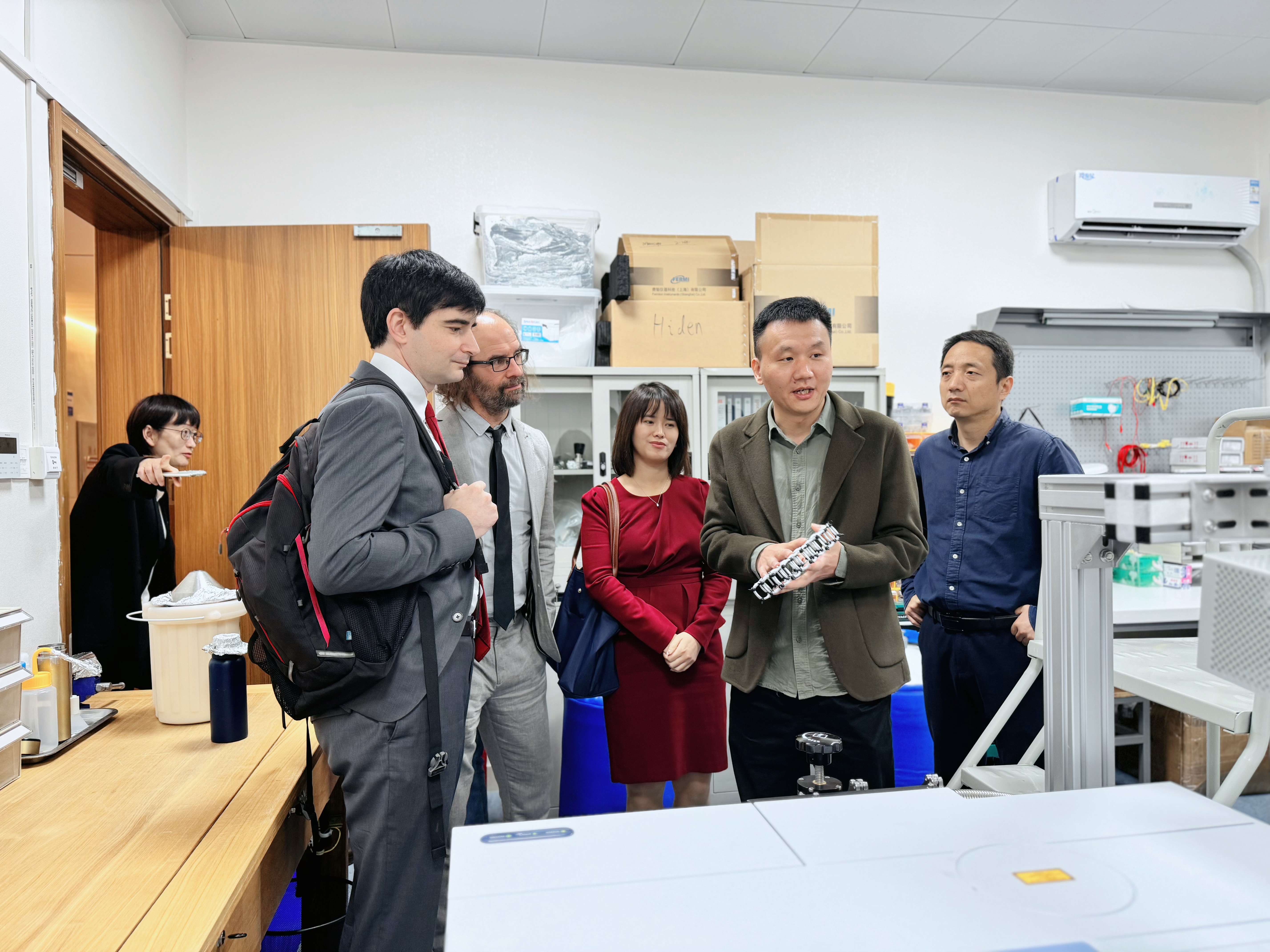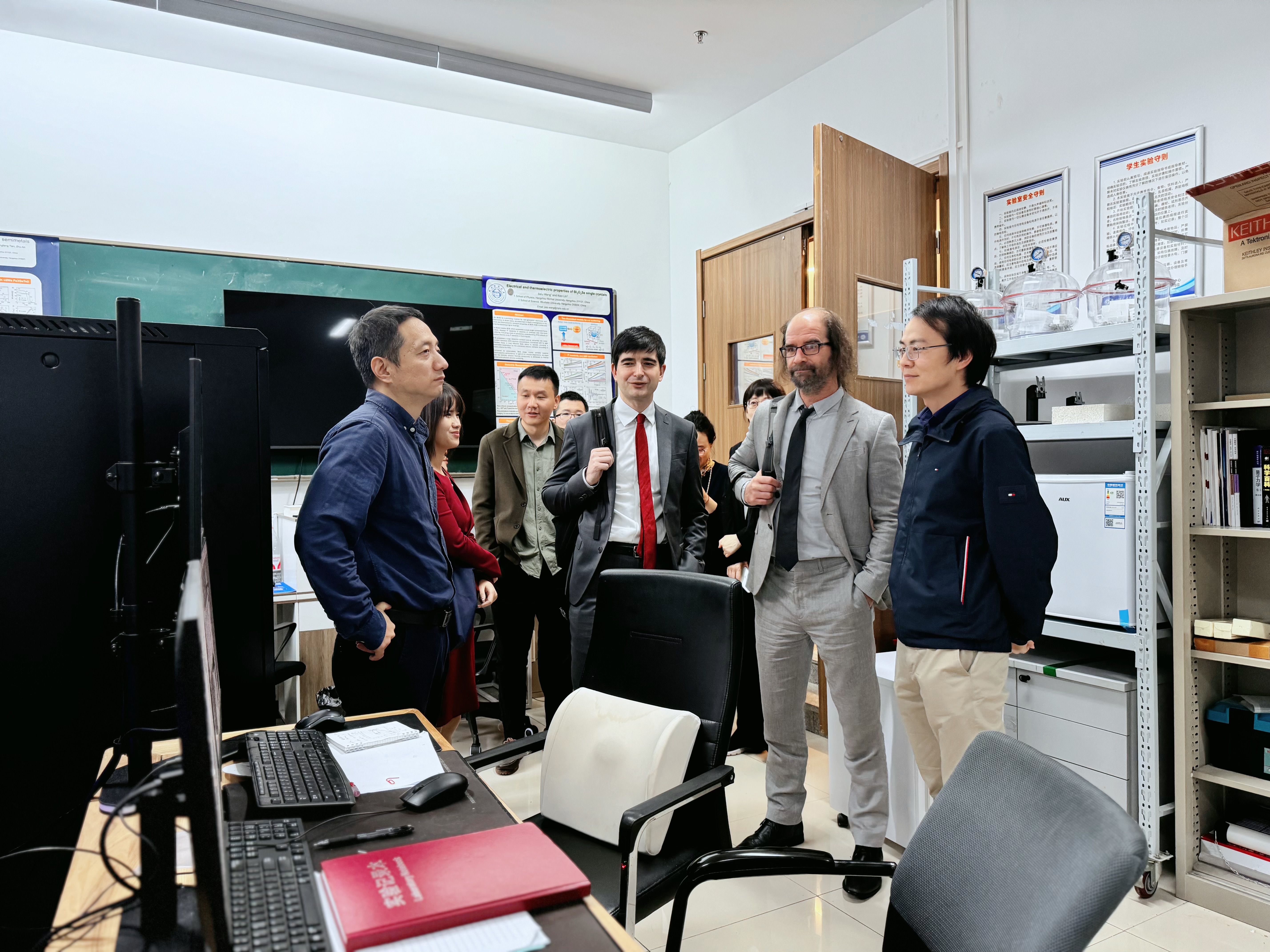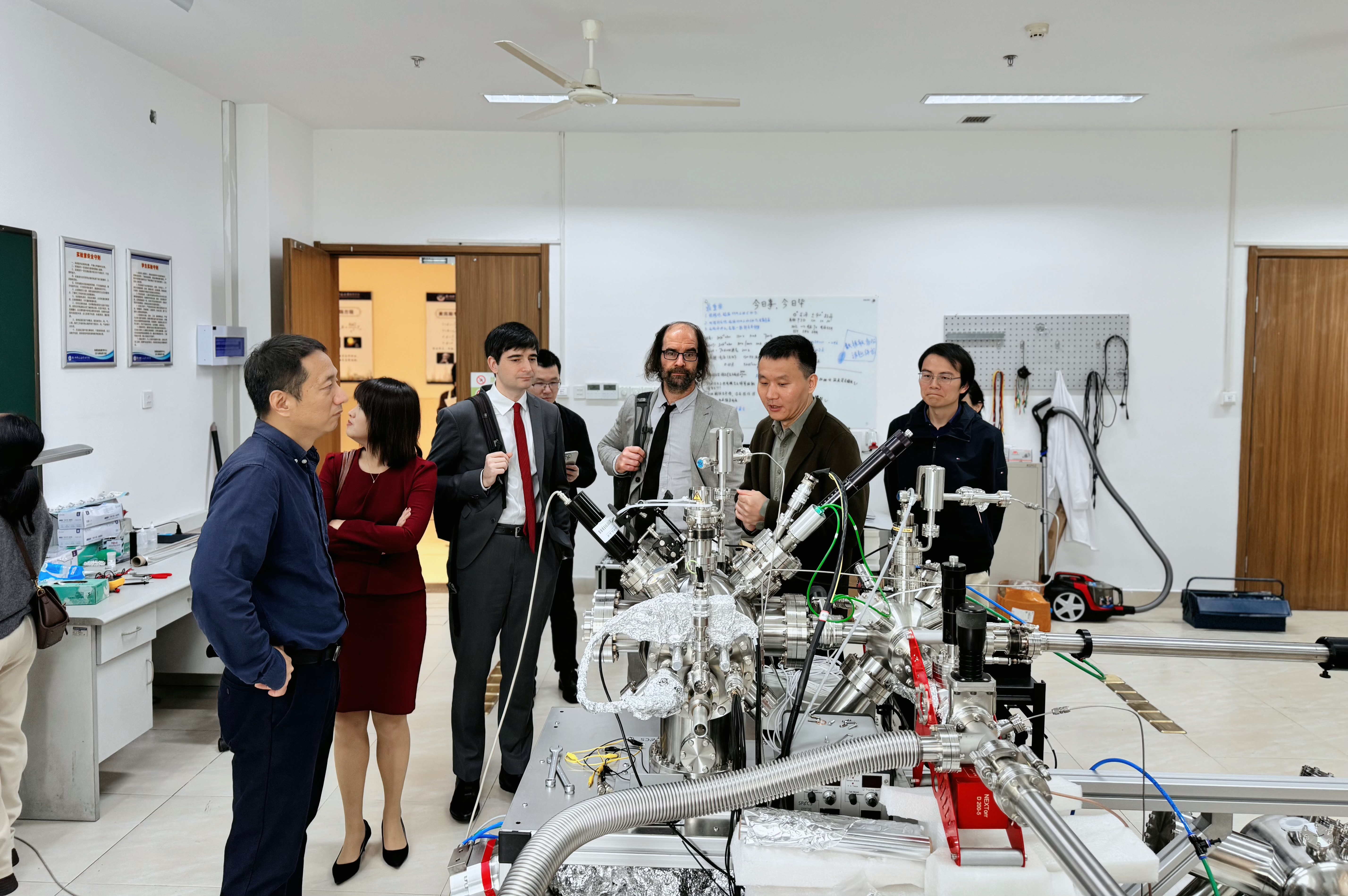 钟建强教授和鲍金科副教授分别向代表团详细介绍了91制片 的科研设备和正在开展的研究工作,重点介绍了91制片 的综合物性表征系统、超高真空红外光谱系统以及隧道扫描显微镜系统。这些先进的科研设备为91制片 的科研工作提供了强大的技术支持。特别是钟教授课题组搭建的超高真空红外反射吸收光谱系统,引起了代表团成员们的极大兴趣,详细询问了相关的研究情况。鲍金科介绍了他科研中经常使用的低温输运测量装置,对于揭示材料的奇异量子物性非常关键。近期发表在Nature上关于笼目超导体的研究就用到了类似的输运测量装置。这一研究成果不仅展示了鲍金科团队的科研实力,也为双方在未来的科研合作提供了更多的可能性。