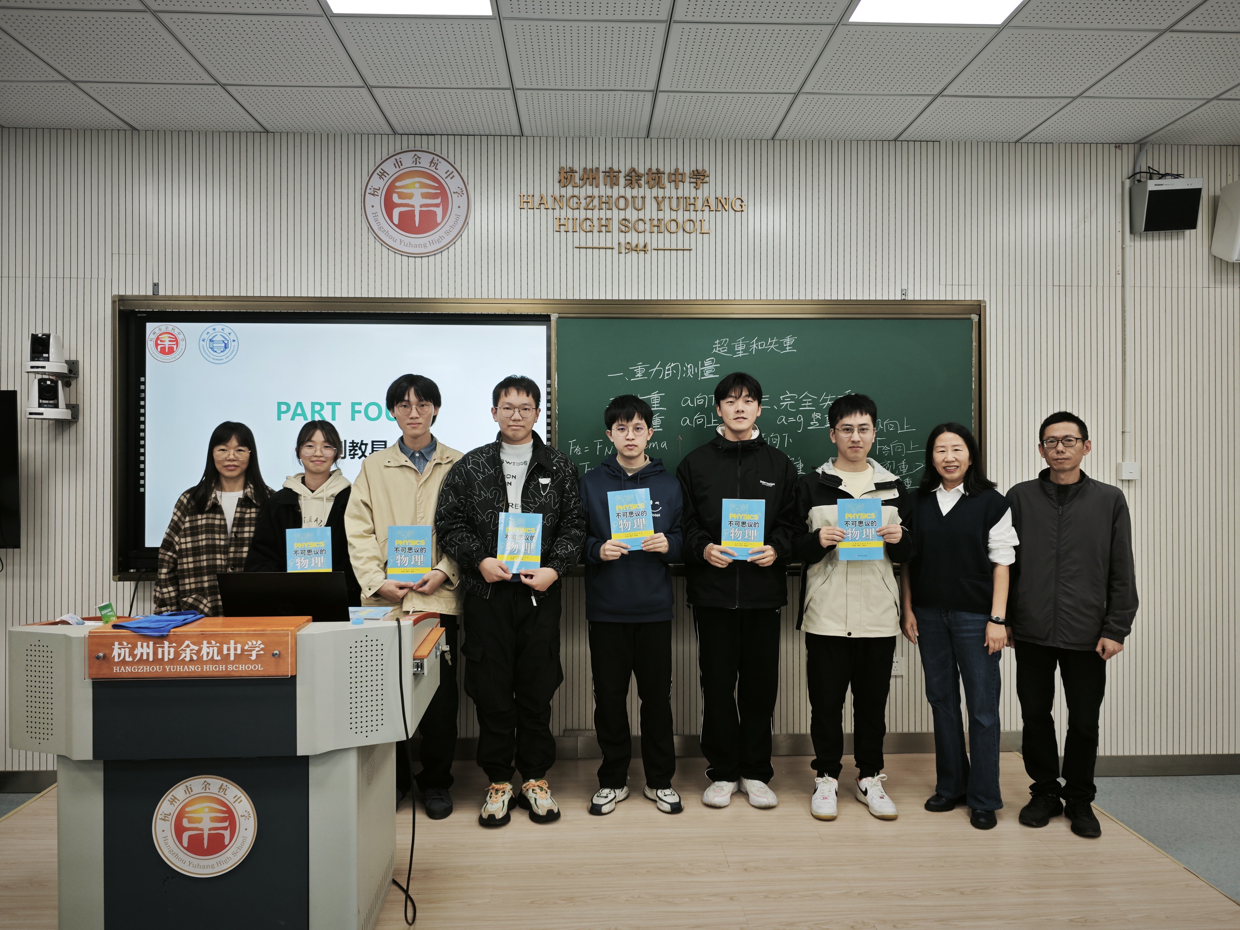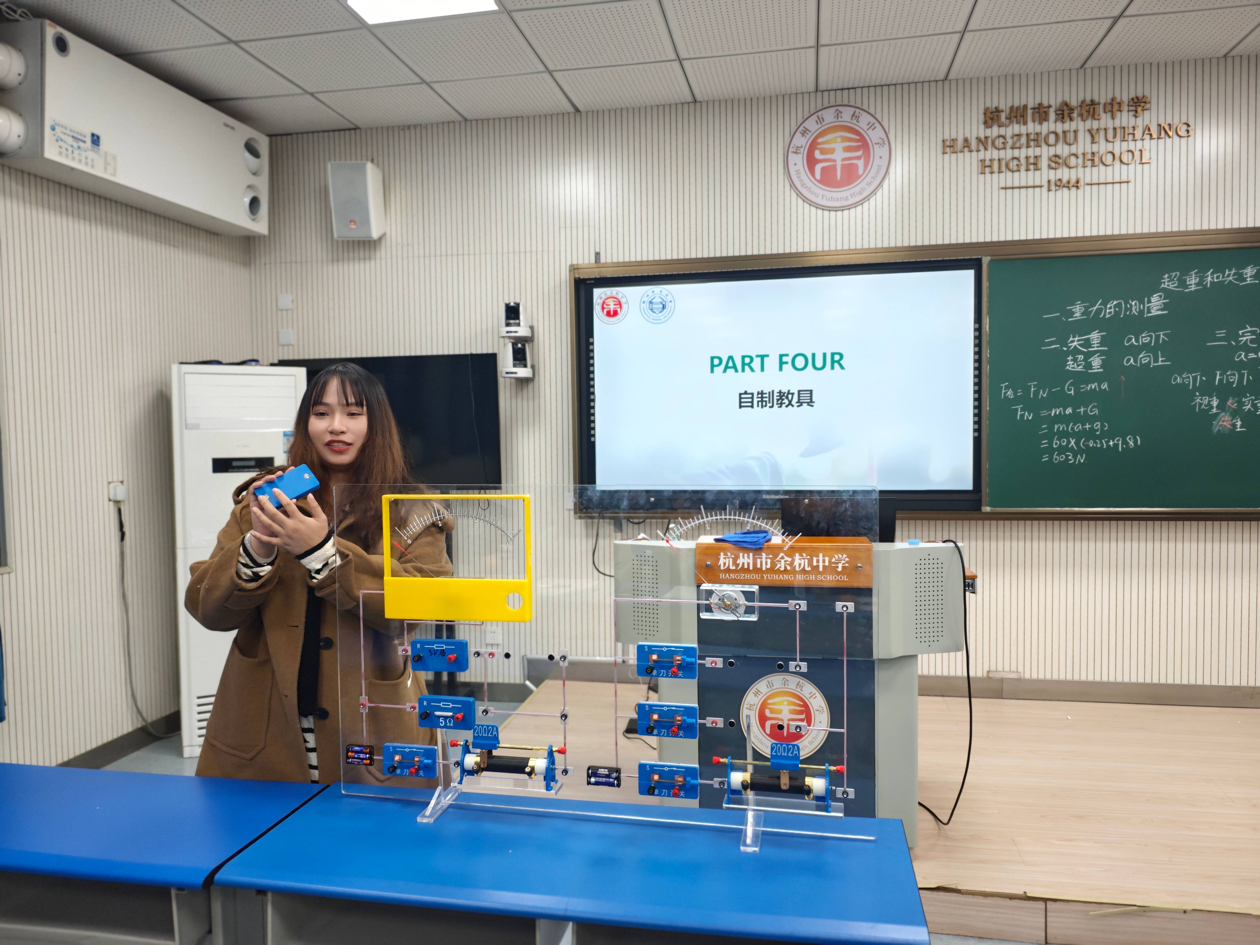 本次活动内容丰富,包括课堂展示、评课交流、专题汇报和自制教具展示等环节。物理本硕211班实习教师丁浩聪带来了一堂《超重和失重》的展示课,通过体重计称量体重的情境,引导学生构建模型,并利用力传感器定量研究物体在竖直方向上的不同运动状态,加深了学生对超重和失重现象的理解。