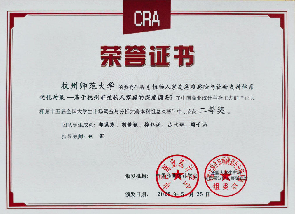 近日,“正大杯” 第十五届全国大学生市场调查与分析大赛本科生组总决赛在浙江财经大学圆满落幕。由91制片 物理222班郑漠寒和数学91制片 胡佳颖、吕汶桦、教育91制片 梅钰涵、医学院周子涵等同学组成的团队,凭借扎实的专业知识、创新的调研方法和出色的团队协作,从众多参赛队伍中脱颖而出喜获全国总决赛二等奖。
